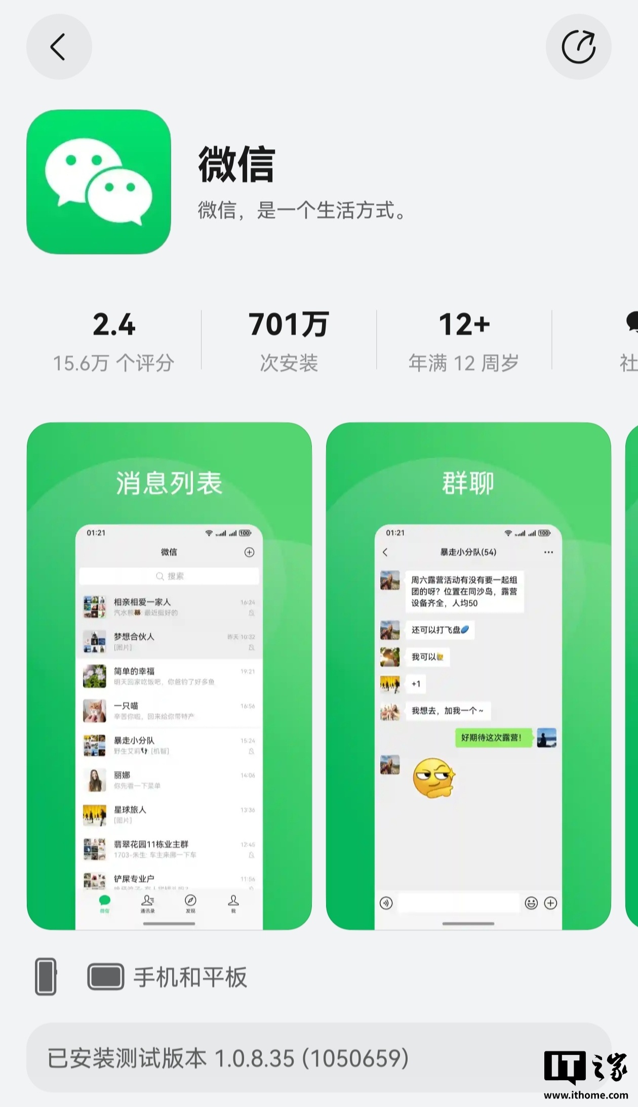 IT之家注意到,鸿蒙版微信的安装量目前超过 701 万次,近一个月内安装量上涨了近 200 万次,评分 2.4 分(基于 15.6 万个评价)。